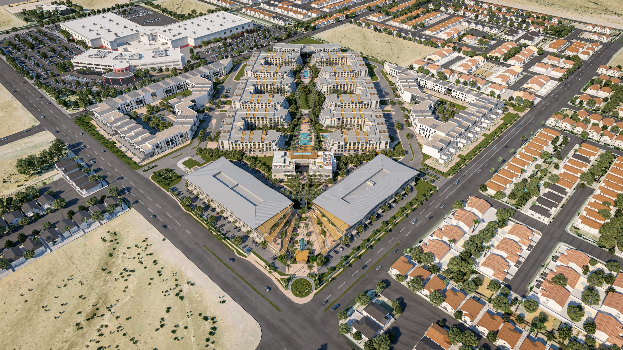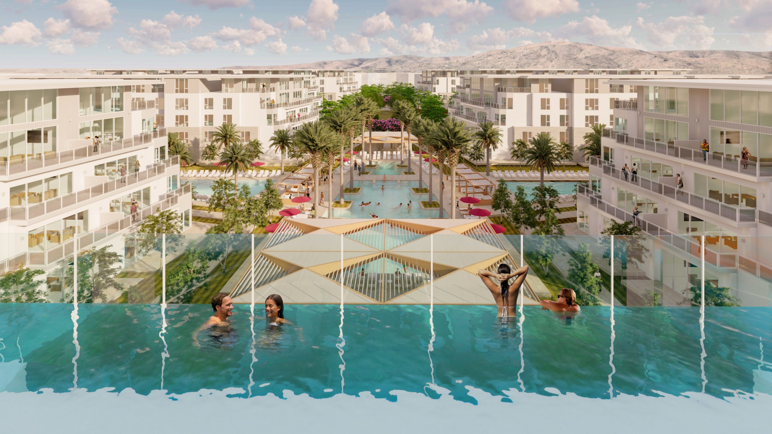 The project’s axial organization maximizes views of the Las Vegas Strip and surrounding mountains while providing a series of central outdoor amenity spaces. The commercial buildings flank a public plaza at the prominent north/east corner of the site that is activated by restaurants and an outdoor performance venue. Large gardens with pools and amenity spaces continue along the diagonal axis through the housing, providing abundant outdoor gathering areas to create a sense of community and encourage interaction.