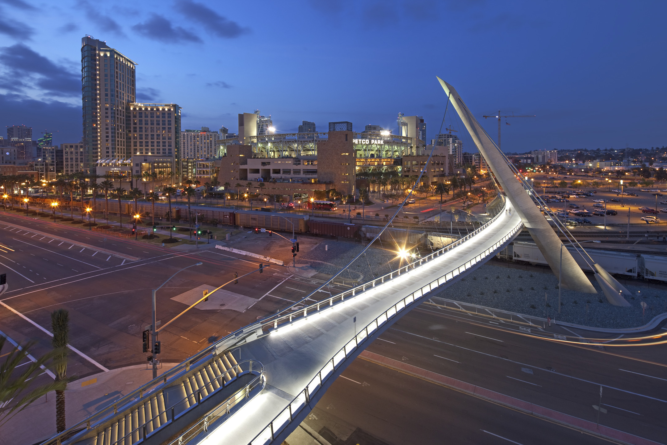 This iconic bridge connects Balboa Park to the San Diego Bay, completing the city’s 100-year-old vision of a Park-to-Bay link. It also provides a safe crossing over the heavily traveled Harbor Drive and existing train and trolley tracks, and links the San Diego Convention Center and a multi-level parking garage on the bay side with a main route into the city’s downtown and nearby Petco Park. The curved span of the bridge is supported by a unique 130′ tall inclined pylon that supports stainless steel wrapped suspension cables attached along one edge of the bridge deck. A two-cab structural glass elevator tower showcases its cables and mechanics, while connecting the plaza level to the bridge deck.