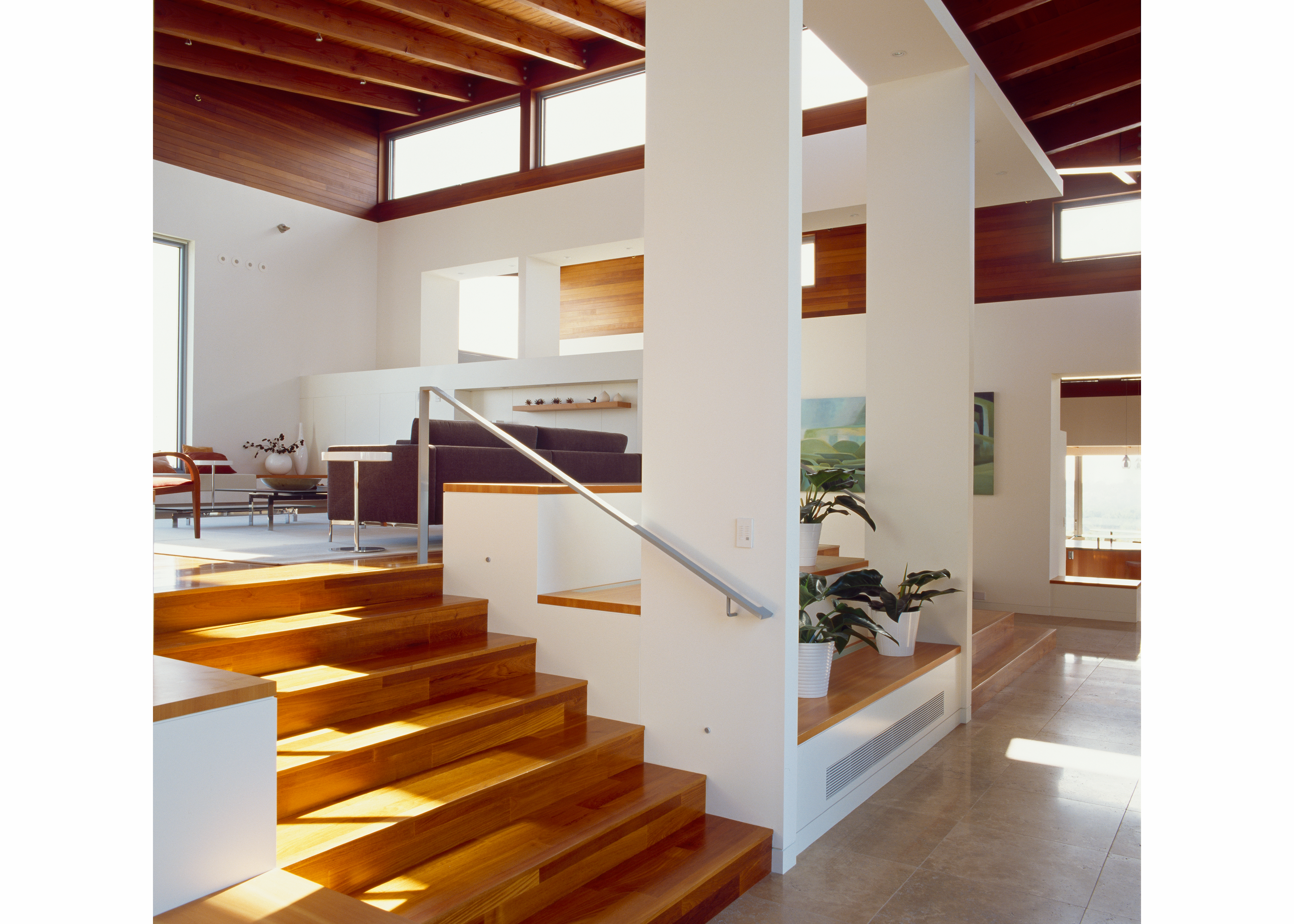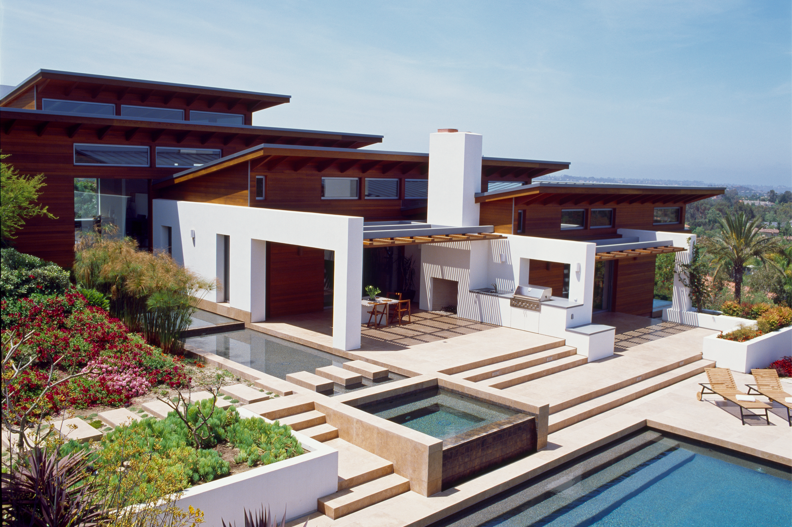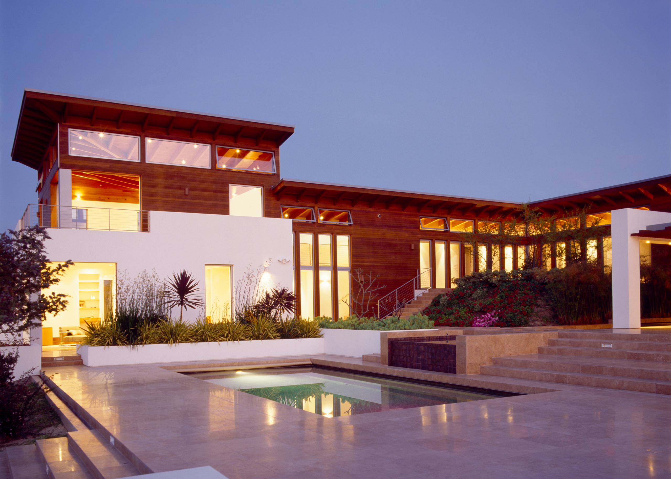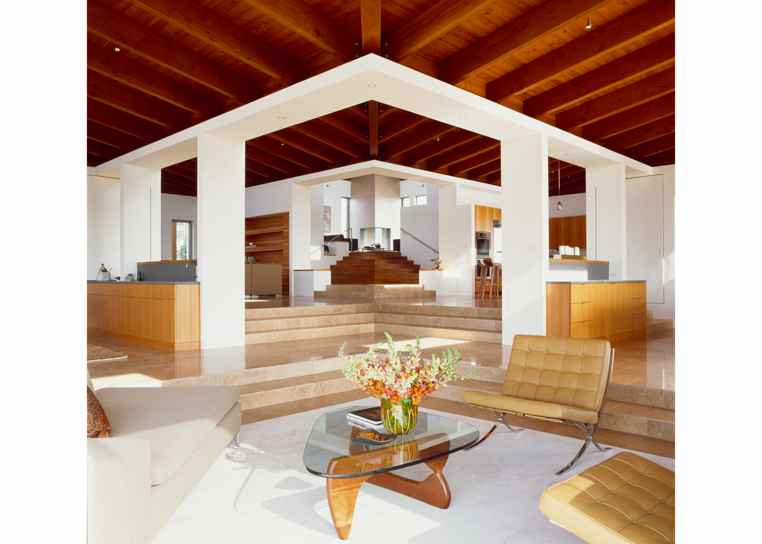 Perched on a mountain top with expansive northwest views, this 10,500 SF house gently responds to the natural typography and steps down the hill. Each level spills out onto an exterior patio with massive glass pocket doors, creating a seamless relationship between interior and exterior spaces. Angled roofs emphasize the stepping quality of the house while providing for views upwards and downwards.