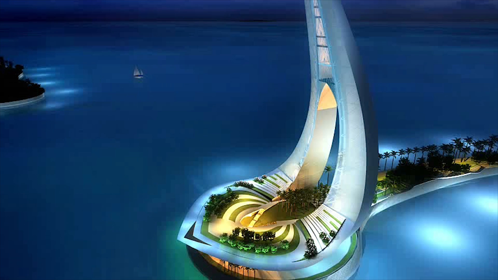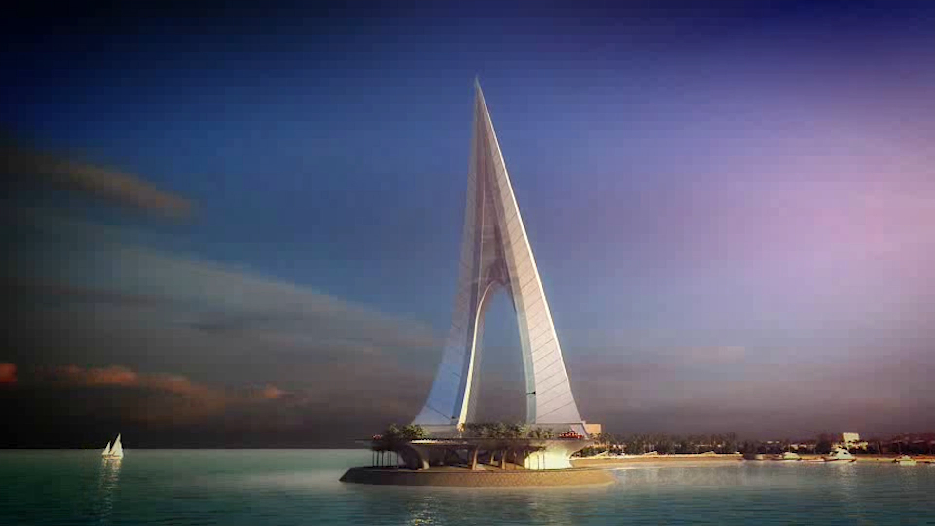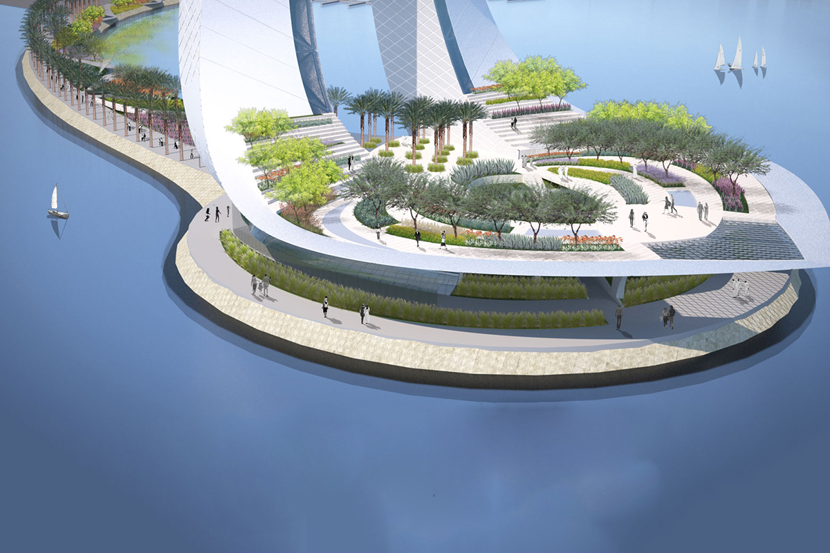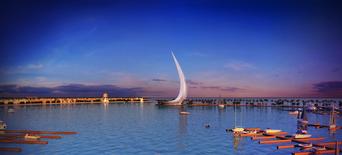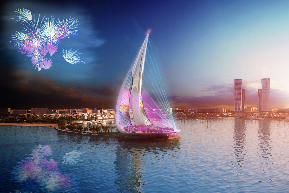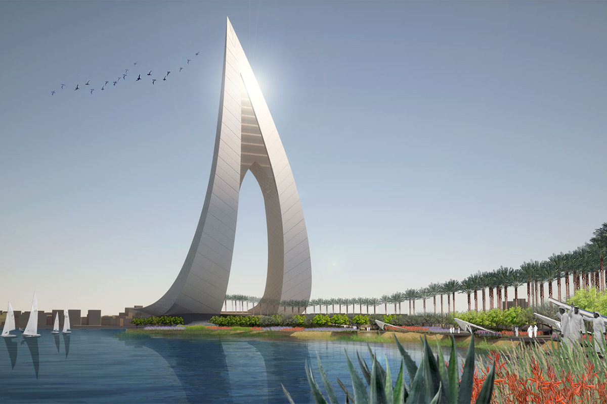 Developed for an international competition with a goal to “build a structure of the highest design that reflects the attributes of Qatar and its home city,” the design for the structure envisions a jewel adorning the “necklace” of Safdie Rabines designed bridges draped along the ring of the marina. The structure resembles a pendant suspended in the sky, dancing with the sun, moon and stars. It is at once a sculpture and a functional building, creating a distinctive place of gathering and celebration that invites, collects, and embraces the people of Qatar. The unique vigor in this peninsula’s exposure to the elements: sun, wind, water and sand, bestow both vitality and hardship, and have shaped the course of human history – this region’s culture in particular. The elements are a source of inspiration for a structure that celebrates nature and observes the rich traditions of the local culture. The structure is abstract, yet reminiscent of familiar forms; a sail in the wind or a wave in the ocean, delicate yet powerful, grounded yet ethereal. Ultimately the subtlety of its form simply calls to mind nature, allowing the structure to be dramatic yet with a sense of belonging. Its sweeping form gestures towards the sky, yet the structure remains firmly grounded, connected to nature, and belonging to the people.