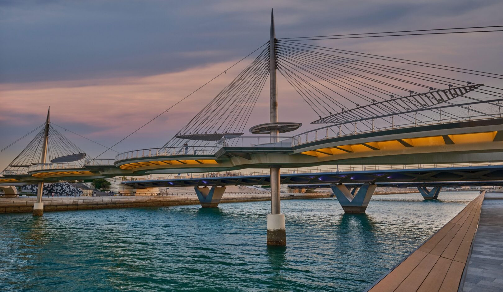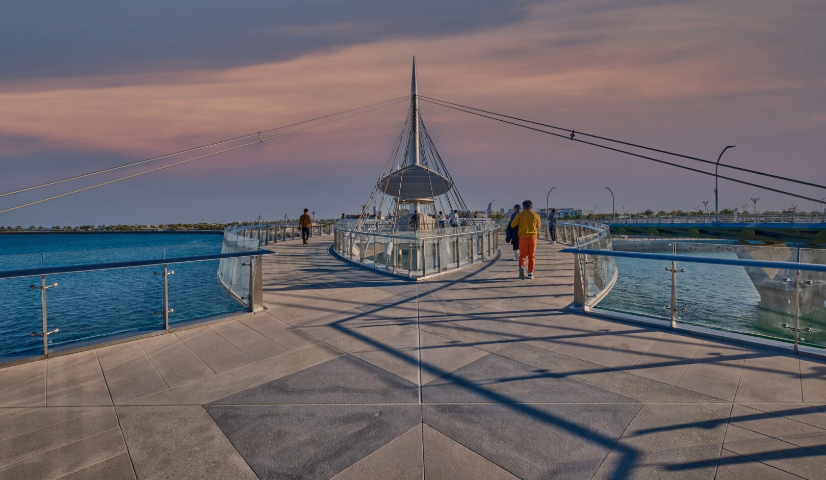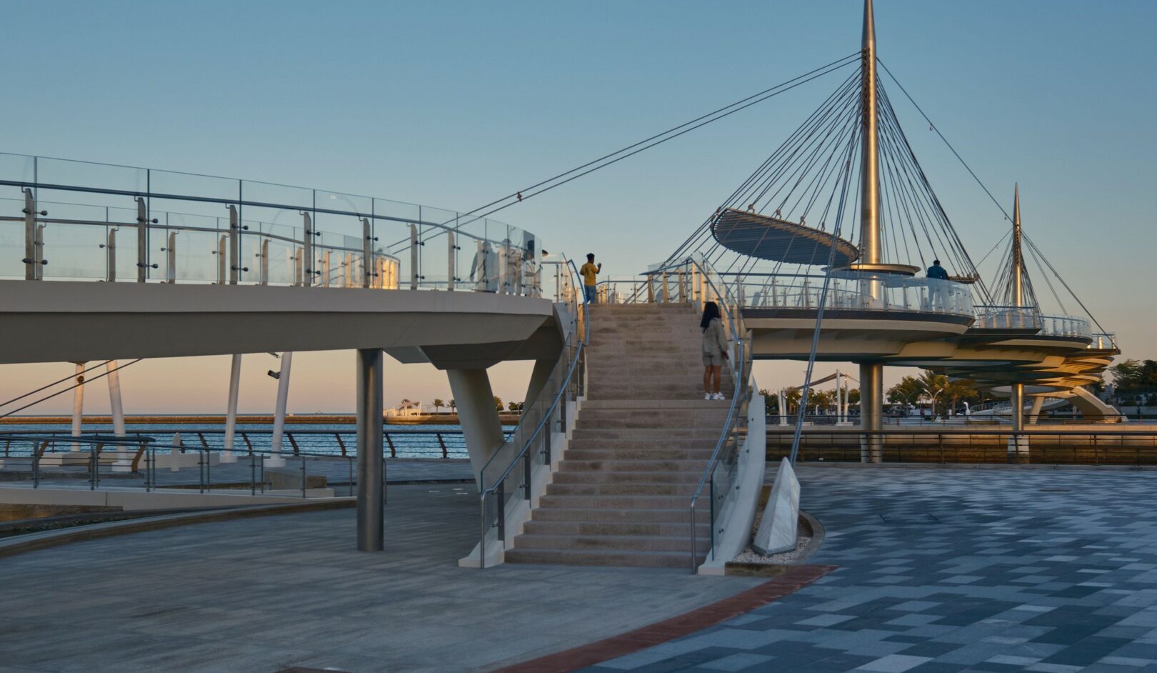 Inspired the city’s theme, Water is Life, the design of these twin pedestrian bridges is that of a delicate “necklace,” draped along the ring of the Qetaifan Island Marina. The bridge’s curves trace the radius of the island’s waterfront, while separate walkways weave across the channel creating a chain, its links supported by stainless steel cables affixed to two concrete pylons. The cables are connected to the deck in alignment with the two paths, intertwining the pedestrian experience of each bridge with the structural system that supports it. The experience of the bridges continues beyond the boundaries of their sites; through the use of pattern and repetition in on-grade pathways, the necklace motif links both bridges and extends their character along the entire promenade.