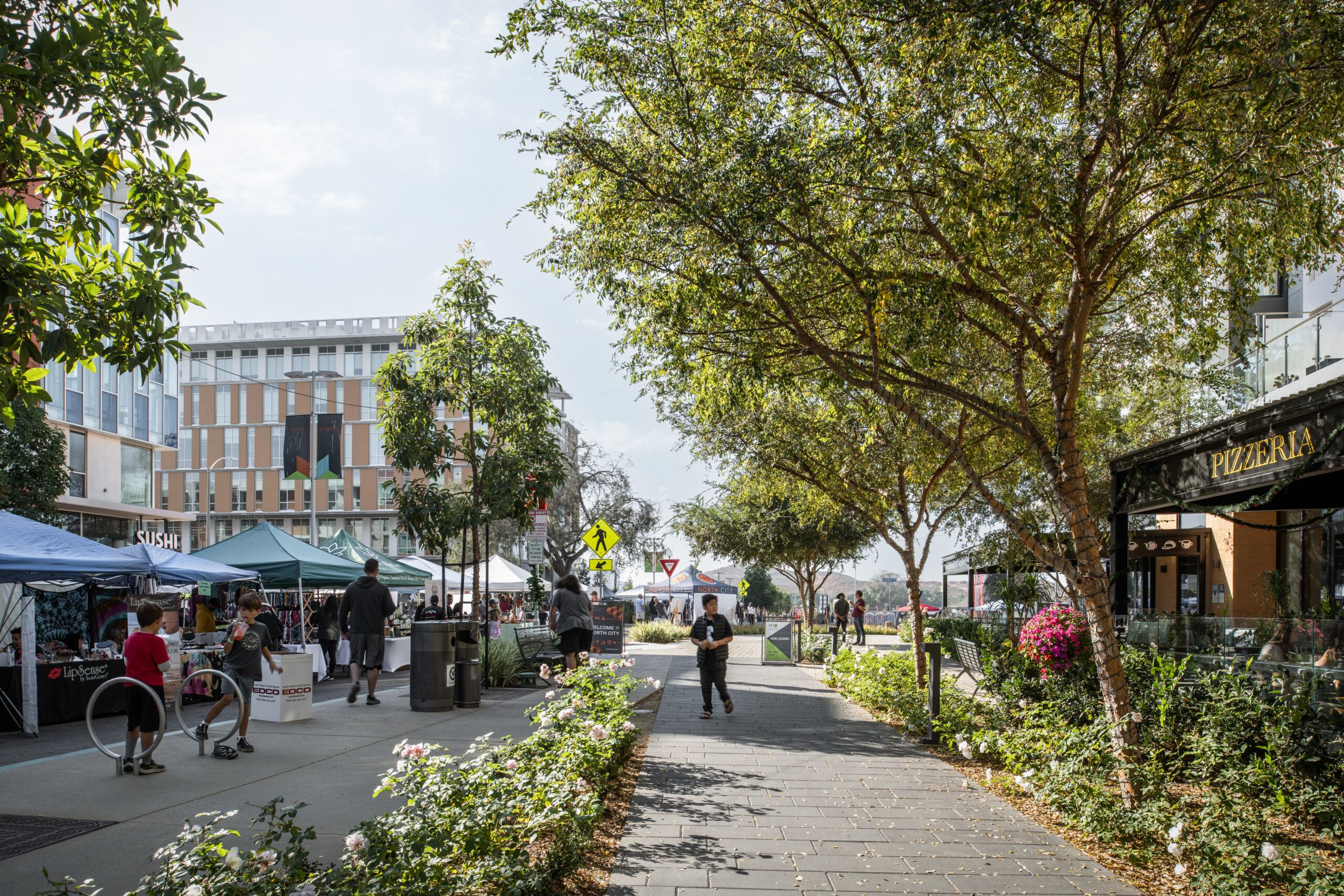 To achieve land use initiatives, the design supports smart growth practices by providing access to nearby mass transit. North City meets LEED-ND certification, maximizing existing topographical conditions and using state-of-the-art stormwater management, including water capture systems to direct and store stormwater, center median bio-swales and hydrodynamic separators that remove sediments and pollutants, and pervious concrete paving that helps to prevent runoff and allow for groundwater recharge.