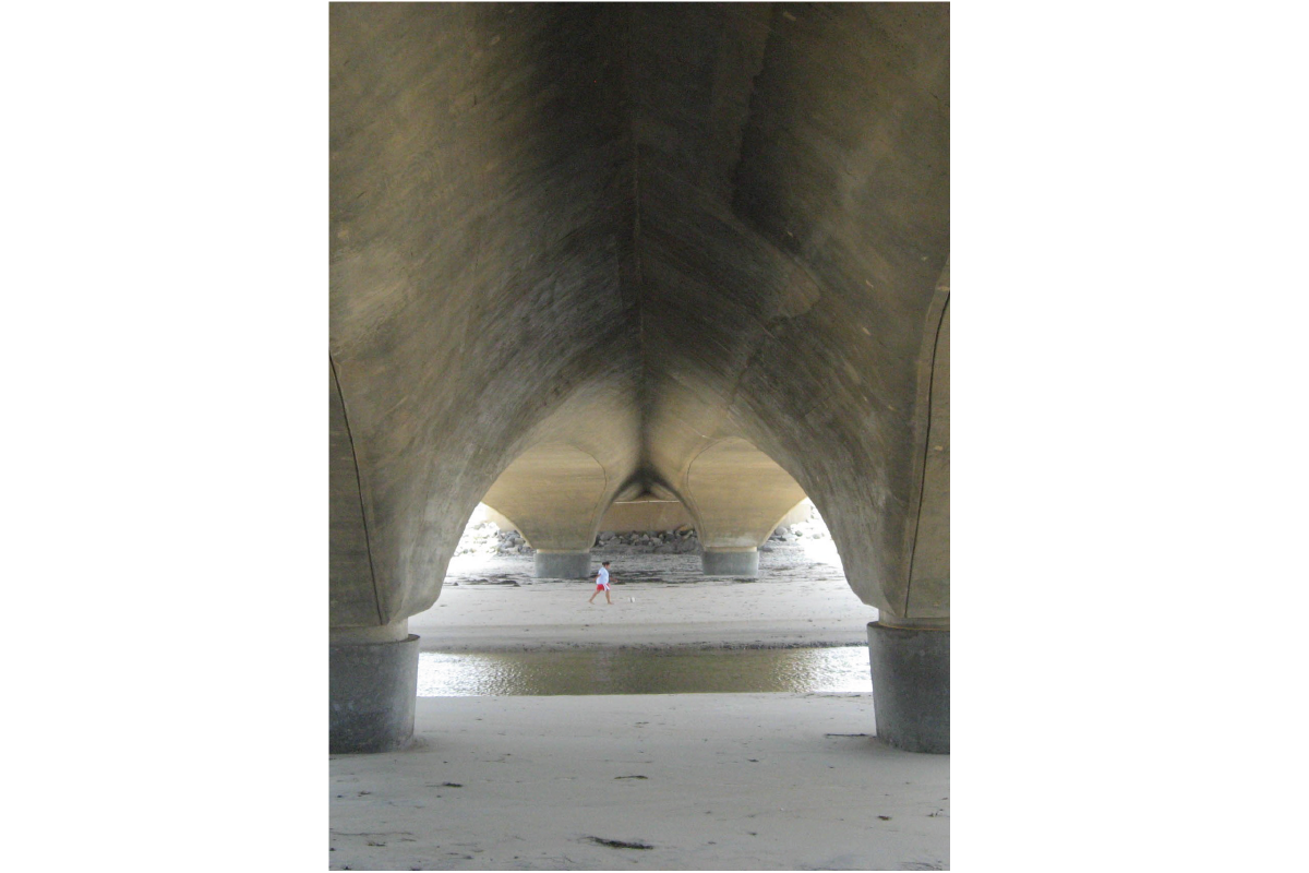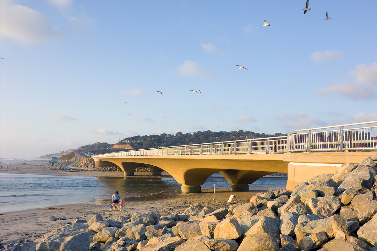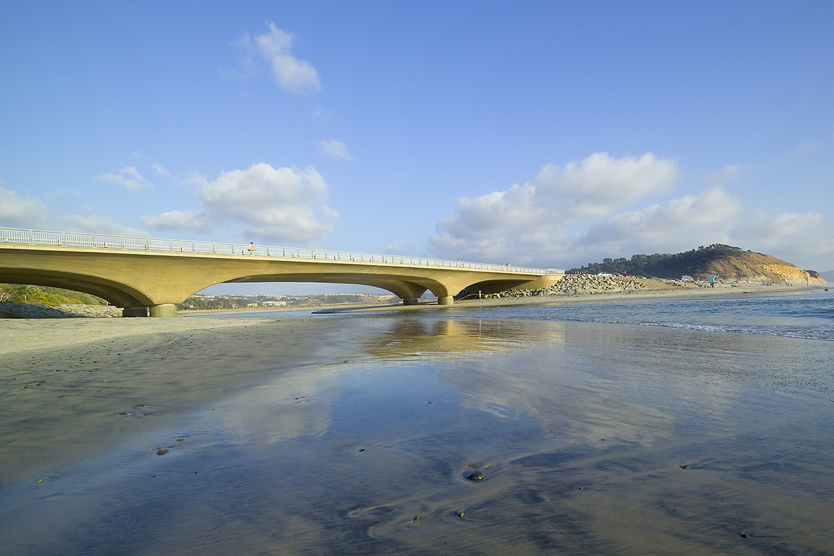The North Torrey Pines Road Bridge replaces a 1930s-era structure deemed to be structurally and seismically inadequate, and environmentally harmful due to poor tidal flushing. The new design; a hunched, 3-span, cast-in-place, pre-stressed box girder with only 4 columns, allows for natural tidal flushing and incorporates elements from the surrounding sandstone formations. Other improvements include ADA access ramps to the beach, a 7′ wide sidewalk, two bike lanes, two bus turnouts and new storm water controls to prevent car pollutants from entering the lagoon. The graceful convex creates a Gothic arch shape that serves as a gateway to the public beach while subtly referencing an adjacent bridge over the railway to the north.