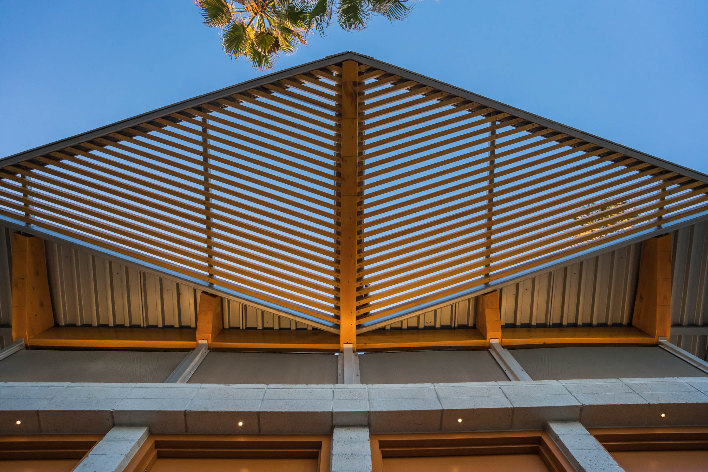 Constructed by concrete masonry units, glulam beams, and a spanned roof of steel and sheet metal, the modernized restroom takes advantage of its durable materials to withstand the weathering of its oceanfront site. Carefully planted vegetation supports the facility as well as permeable pavers that wrap around the building creating a wave-like pattern and multiple pathways throughout the site.