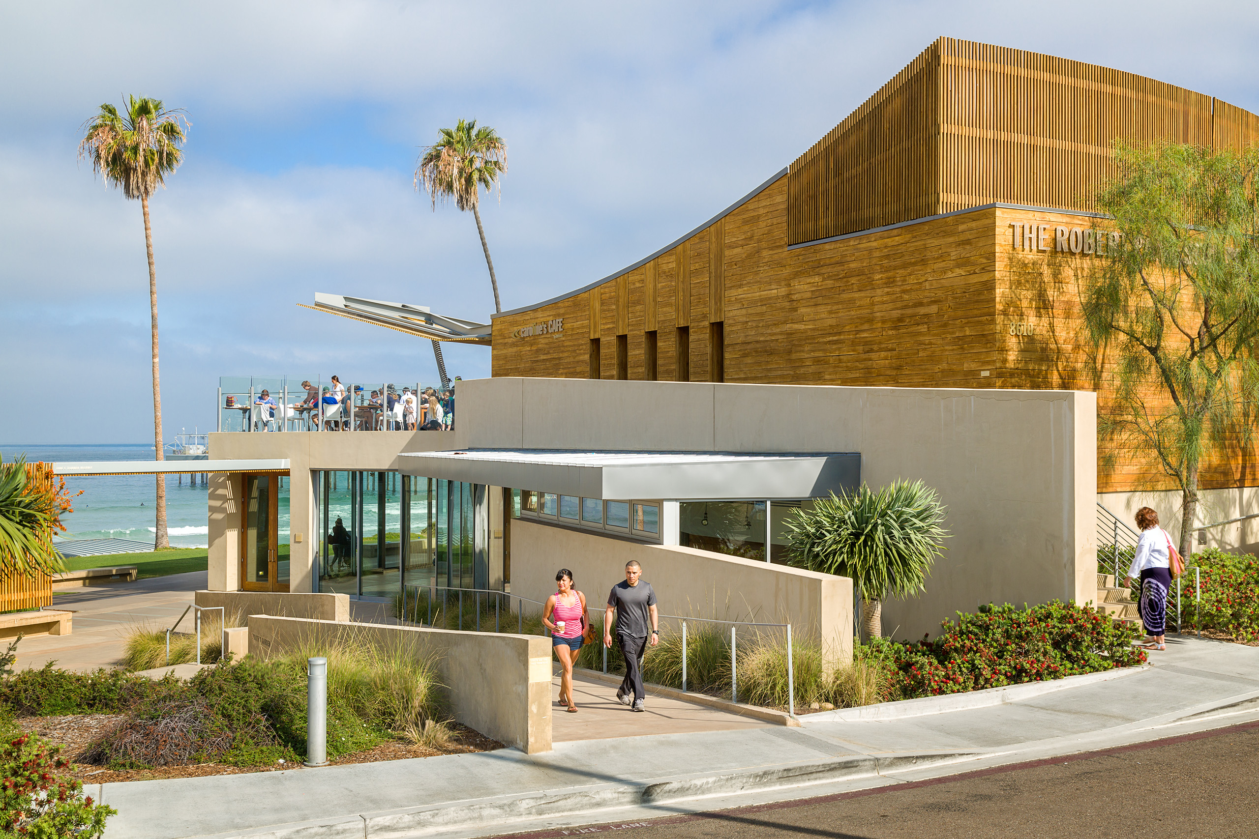 With Scripps Institute of Oceanography’s global approach to oceanographic research and its impact on the environment, the Seaside Forum serves as an important physical location for leading researchers from around the world to gather in. Located on the beach with strong winds, western sun, and an existing grove of palms, the Forum’s design responds to its unique and dramatic location while shielding guests from the elements and framing views of the ever-changing ocean. The project includes a flexible auditorium, four meeting rooms, a student lounge, a catering kitchen, and a rooftop restaurant. The facility is divided into several small, village-like structures linked by a trellis, creating a porous design that maintains public access and views of the ocean. The auditorium is tucked into the hillside to minimize its mass from the east, allowing for gentle ramps to access roof terraces. A series of large pocketing doors between the auditorium, lobby, and oceanfront terrace allow the main space to accommodate a wide variety of functions while simultaneously maximizing ocean views.