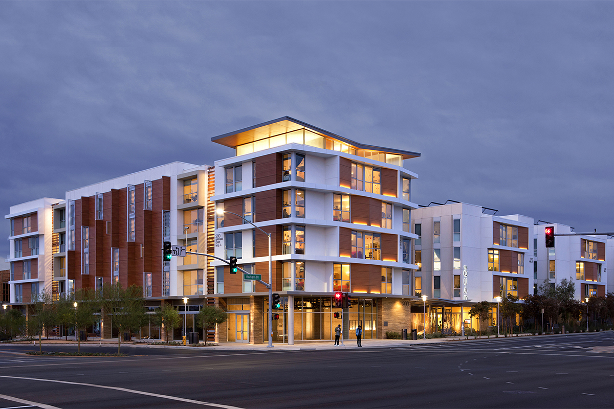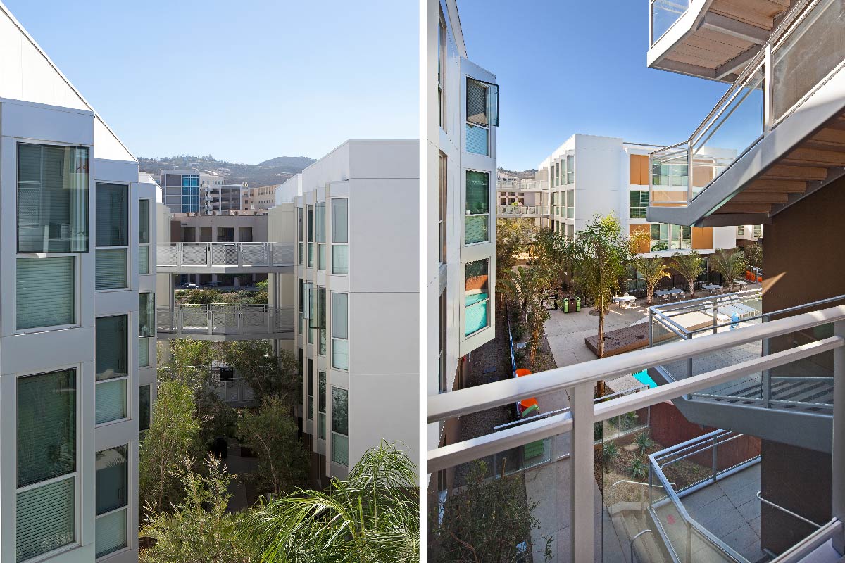 The QUAD is comprised of six buildings organized around a series of outdoor spaces including a large central courtyard. Exterior bridges and stair towers link the buildings, and sculptural stairways serve clusters of apartments creating natural meeting places for students. The courtyard includes a pool, barbecue area and lounges along the perimeter.